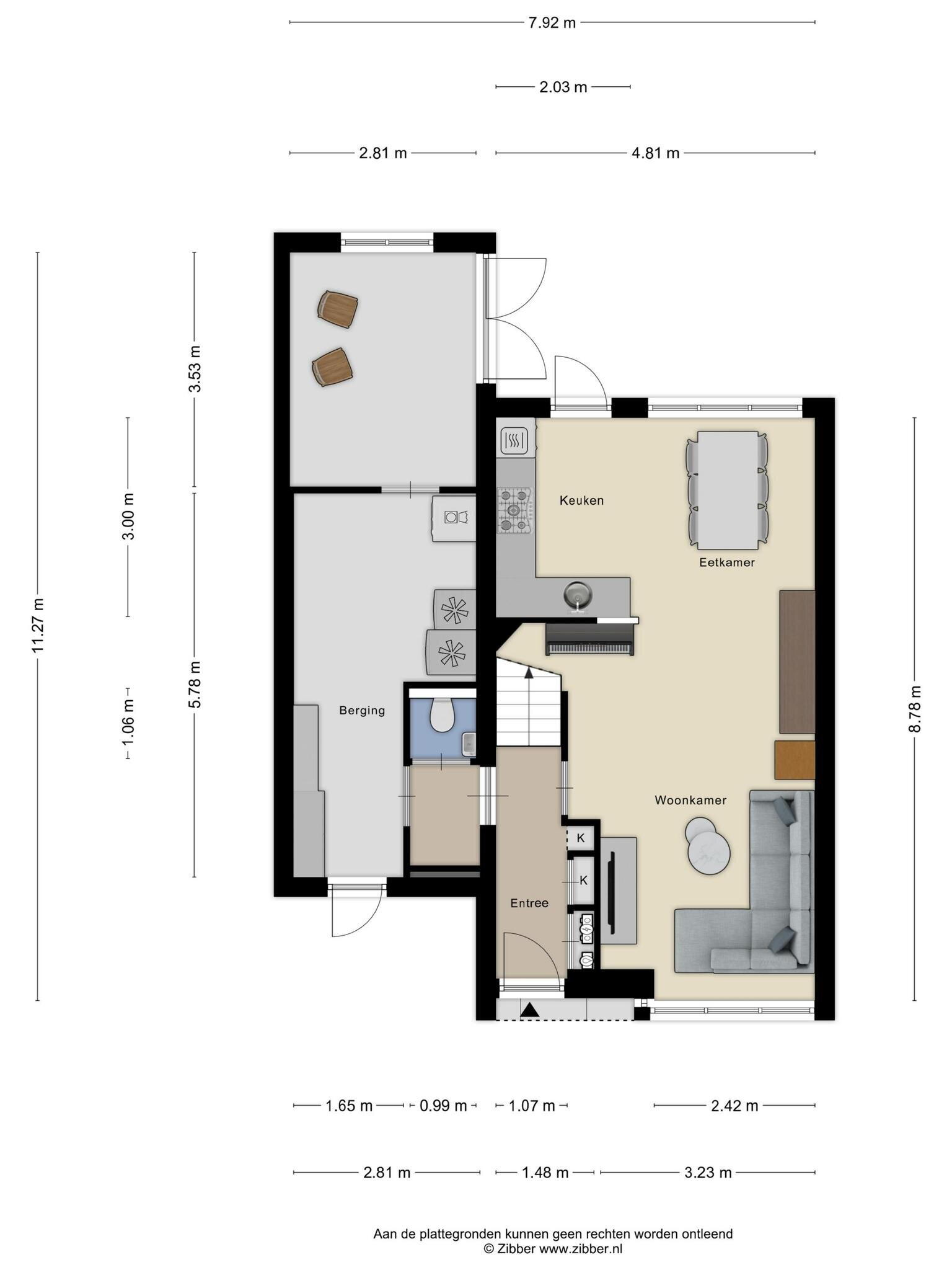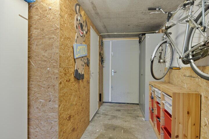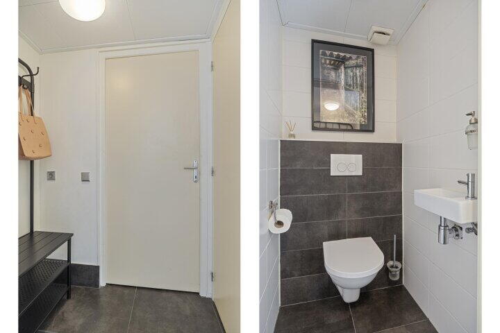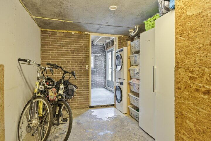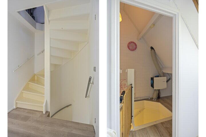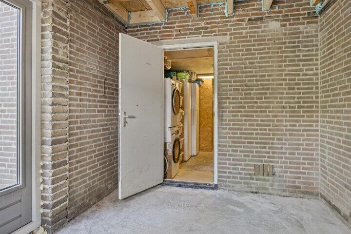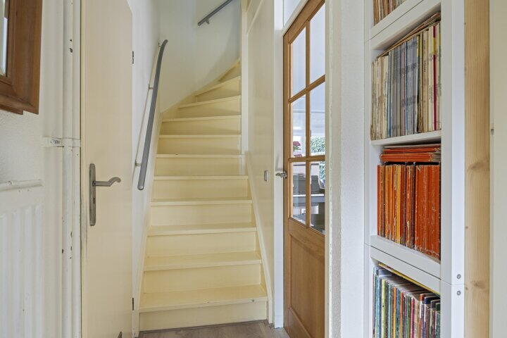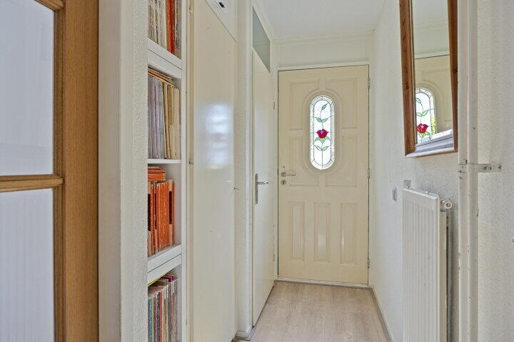 Je komt binnen via de oprit en stapt direct in een lange hal die een fijne eerste indruk geeft. Helemaal achteraan bevindt zich de trap naar boven. De hal biedt toegang tot de verschillende vertrekken op de begane grond. Daarnaast is er een handige berging aan huis, ideaal voor fietsen, de wasmachine en extra opslag.