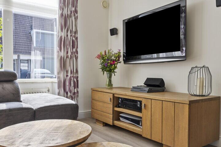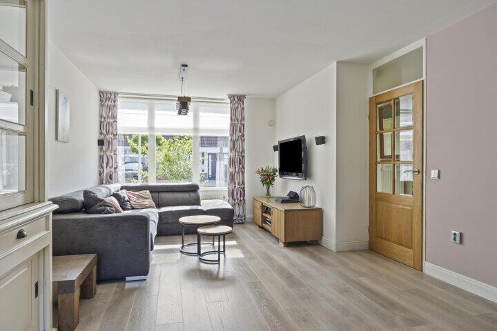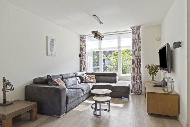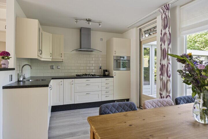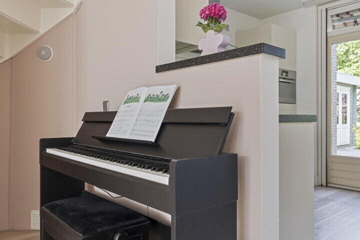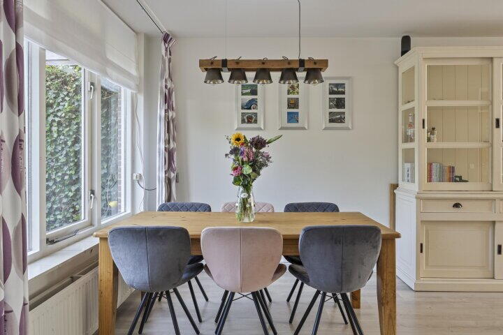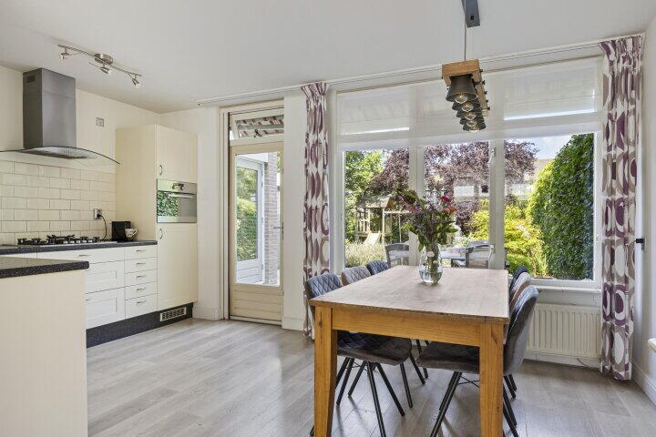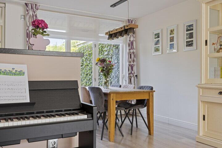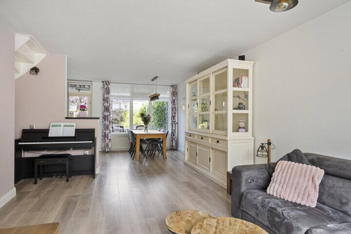 De woonkamer is ruim, licht en verzorgd, met grote ramen die zorgen voor een warme en uitnodigende sfeer. Rechts vind je een gezellige zithoek, perfect voor een avondje ontspannen of gewoon lekker naar buiten kijken. Links is er ruimte voor bijvoorbeeld een piano, thuiswerkplek of speelhoek – helemaal naar eigen wens in te richten. Vanuit de eetkamer kijk je uit op de tuin, wat zorgt voor een fijne verbinding met buiten. De halfopen keuken sluit mooi aan bij het interieur, met off white kastjes, een stijlvol zwart blad en beige wandtegels die samen zorgen voor een moderne, frisse uitstraling. Uiteraard is de keuken van alle gemakken voorzien.