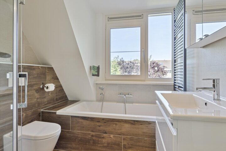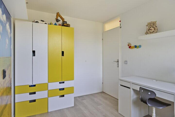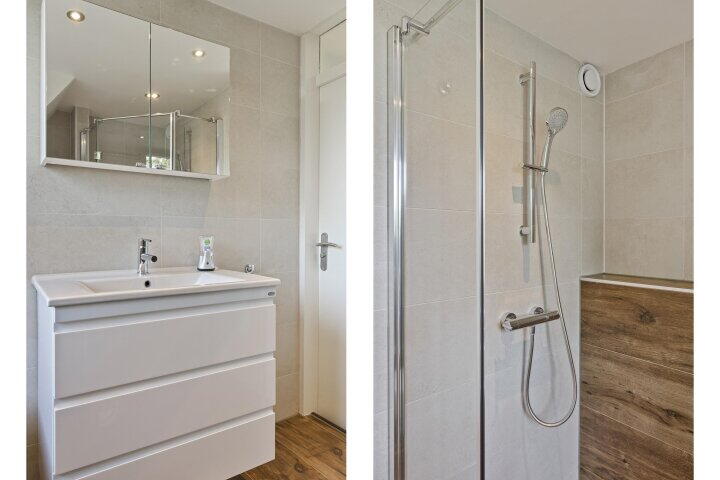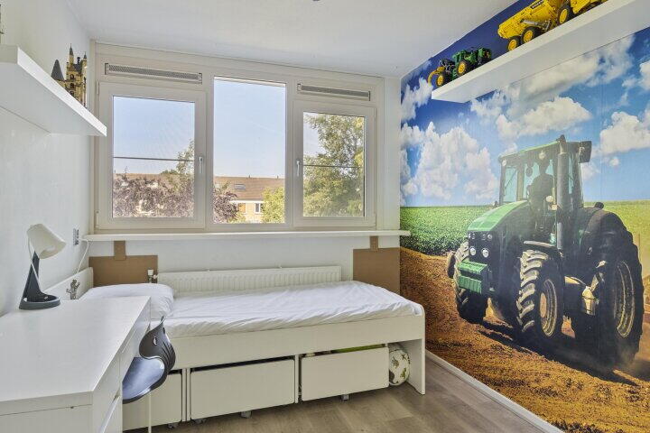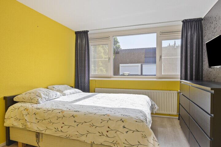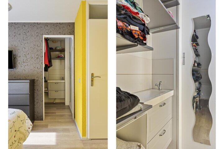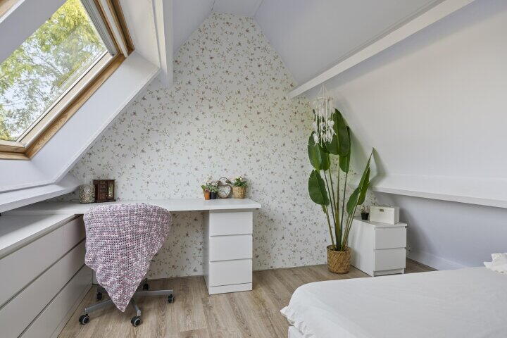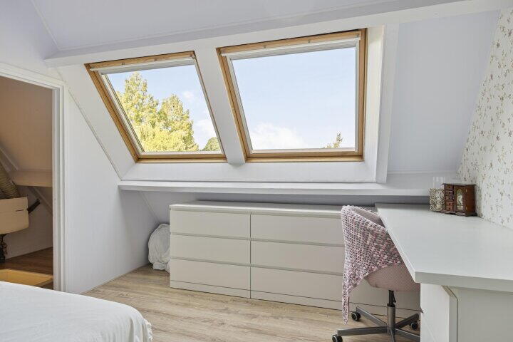 Op de eerste verdieping vind je twee ruime slaapkamers. De master bedroom is een eyecatcher met veel licht, een royale indeling en een grote walk-in closet met eigen kraantje. Ook de tweede slaapkamer is ruim, licht en praktisch dankzij de rechte muren. Op de tweede verdieping ligt een derde, keurig afgewerkte slaapkamer met twee dakramen – perfect als logeerkamer, thuiskantoor of extra slaapruimte. De moderne badkamer maakt het helemaal af: wit sanitair, houten accenten, een riant bad, aparte douche én toilet zorgen voor een luxe start van je dag.