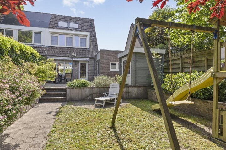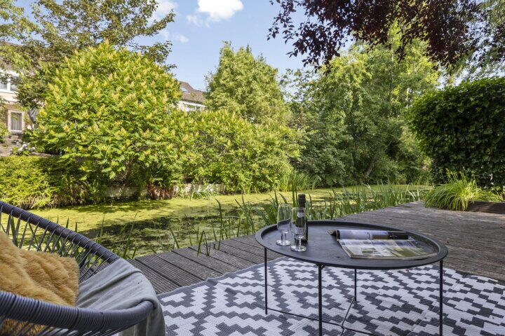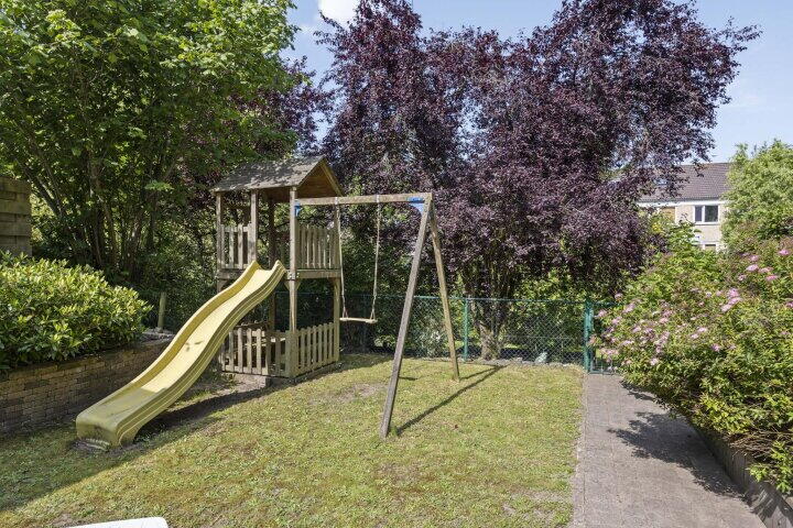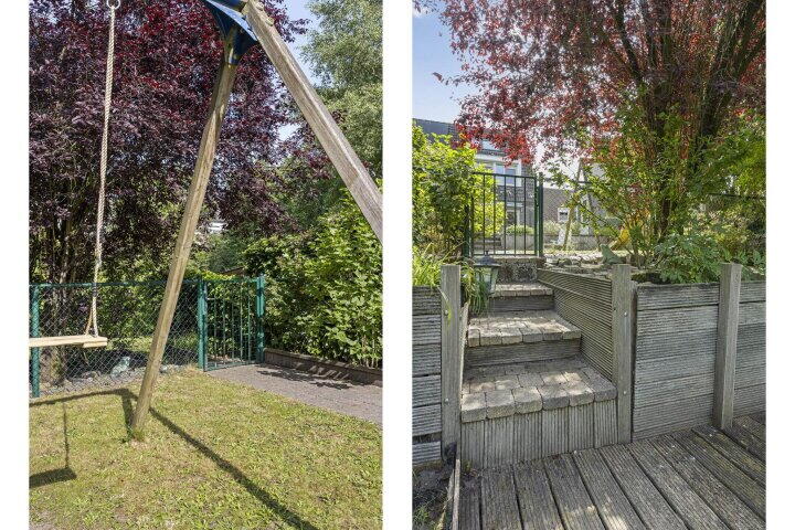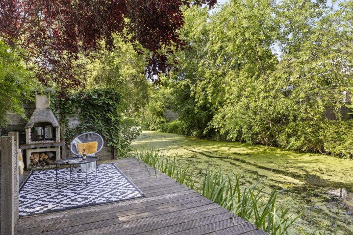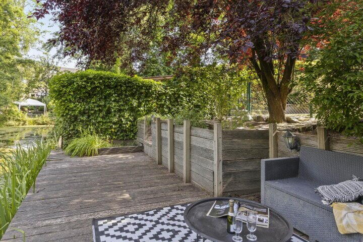 Een niveau lager ligt een grasveld met speeltoestel en achterin vind je een vlonder aan het water. Hier geniet je in alle rust van je koffie in de ochtend of een wijntje bij zonsondergang. Een plek waar je echt tot rust komt!